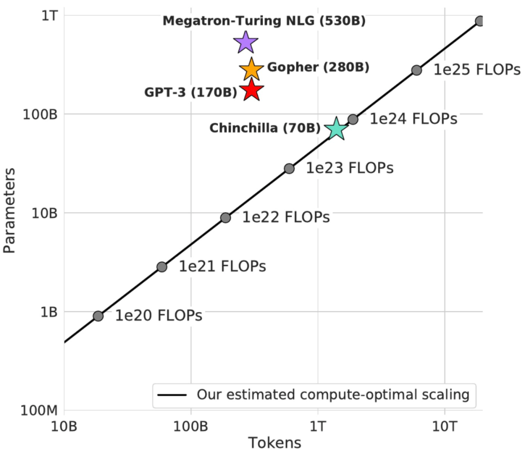 几周前,DeepMind 重新审视了 Kaplan 等人的发现,并意识到:与人们认为的相反,训练 token 的数量对性能的影响与模型大小的影响一样大。DeepMind 得出结论:计算预算应该平均分配给扩展参数和数据。他们用大型语言模型 4 倍的数据量(1.4T token)训练 Chinchilla(70B)证明了这个假设。