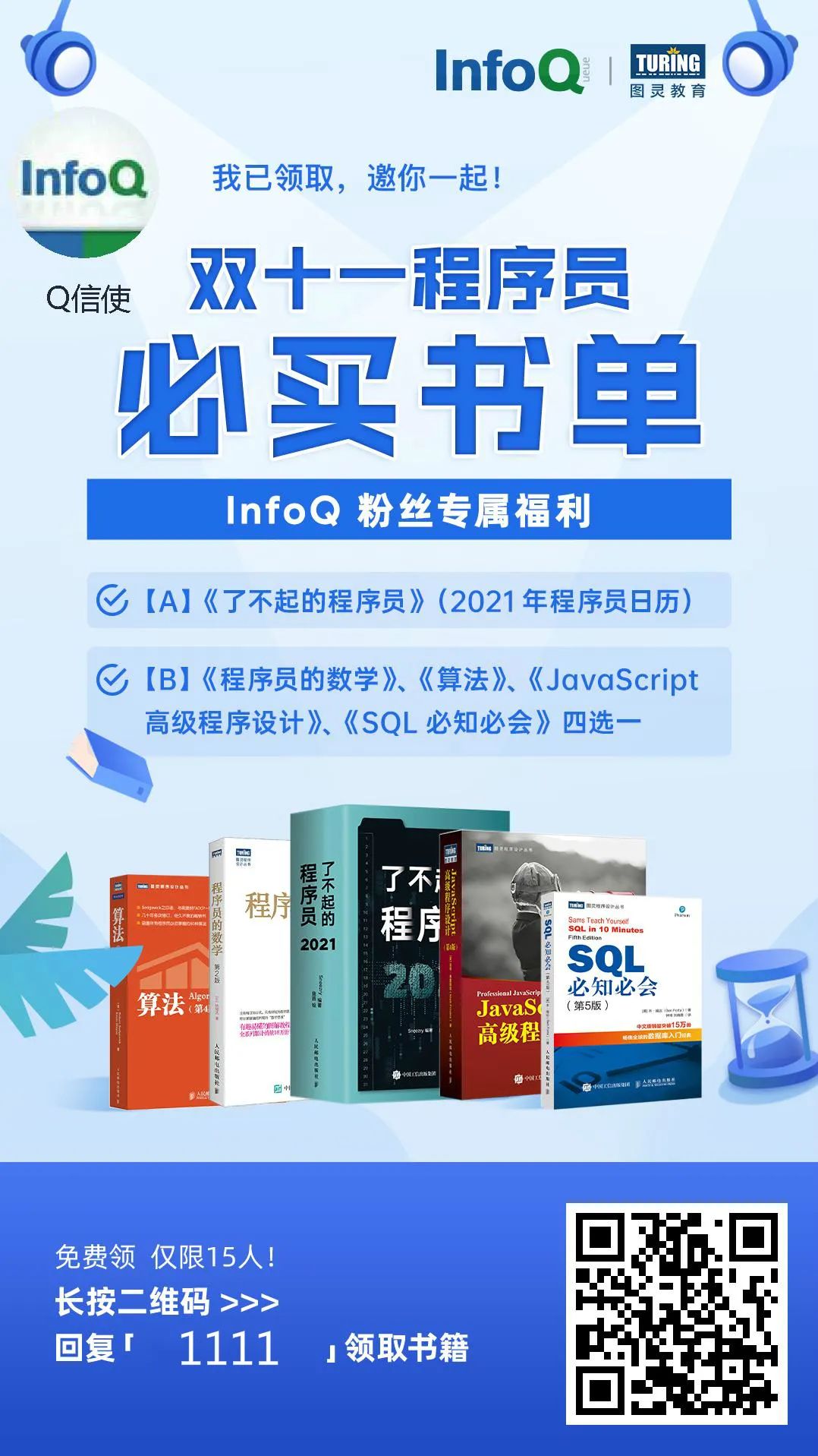 今年的双十一来的比以往更晚一些,想必各位也已经做好吃土的准备了。这个时候,就更需要你充实自己,努力工作,加速进步,来看看今年 InfoQ 联合图灵出版社为你精心挑选的几本程序员必备图书吧~当然,身为 InfoQ 粉丝的你,有机会免费领取哦~下面是书籍介绍,参与方式可直接拉至文末哦~
