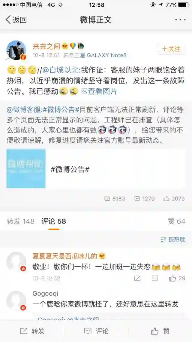每次遇到大事件,微博必故障,微博客服公告:#微博公告#目前客户端无法正常刷新、评论等多个页面无法正常显示的问题,工程师已在排查(具体怎么造成的,大家心里也都有数),给您带来的不便敬请谅解,修复进度请您关注官方账号最新动态。