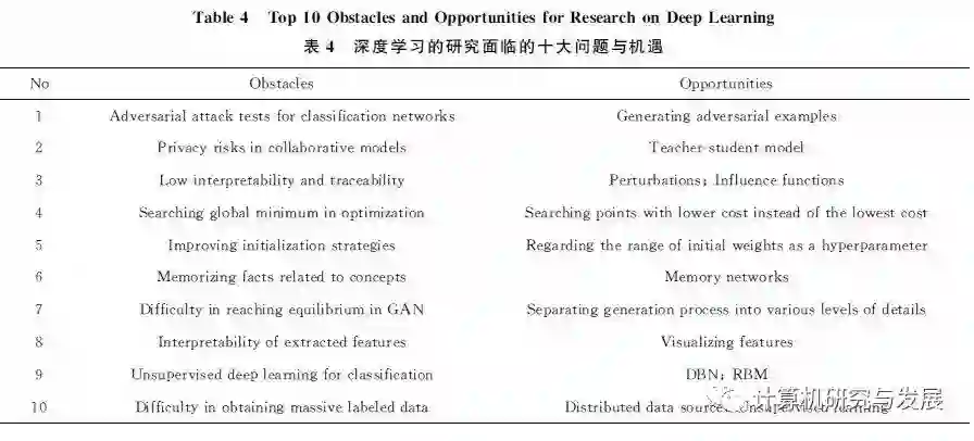 对十大问题与机遇中主要问题及其解决方案进行了分析,指出对于分类的应用易受对抗攻击,最有效的防御方案是对抗训练;基于协作性深度学习进行分类的安全应用易受隐私窃取攻击,防御的研究方向是教师学生模型.最后,指出了深度学习应用于网络空间安全未来的研究发展趋势.
