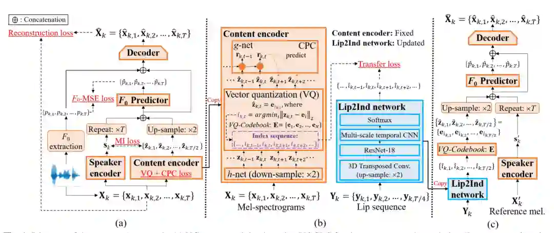 本文提出了一个新颖的基于跨模态语音转换的知识迁移的多说话人VTS系统,其中矢量量化与对比预测编码用于语音转换的内容编码器来提取离散的类音素的声学单元,该声学单元随后迁移到一个嘴唇到索引(Lip2Ind)网络的学习来预测声学单元的索引序列。Lip2Ind网络能替换语音转换系统的内容编码器来构成一个多说话人VTS系统,用于将静音视频片段转换成声学单元来重构准确的说话内容。VTS系统同时还继承了语音转换的优点,通过采用一个说话人编码器来提取说话人表示用于有效地控制生成语音的音色。