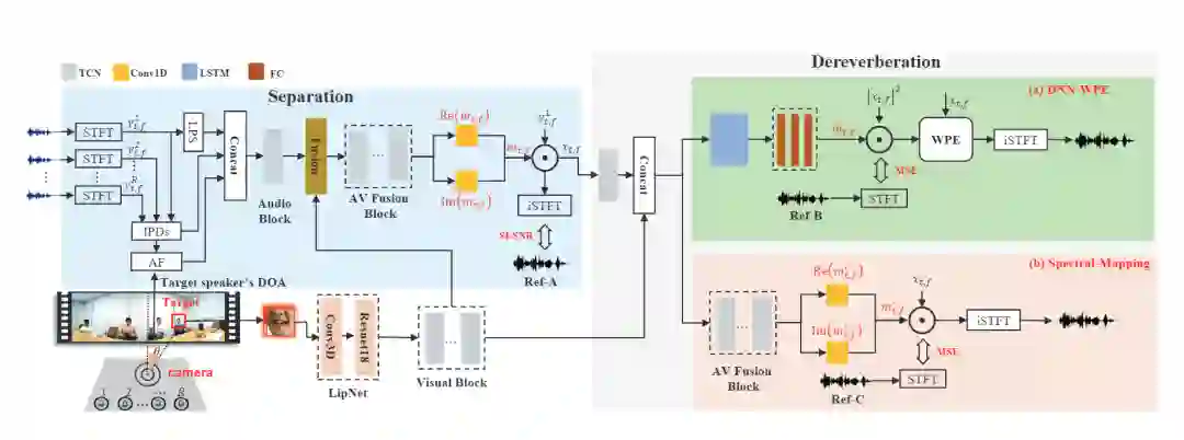 本文提出了一种将视觉模态同时应用于语音分离,语音去混响和语音识别的一体化系统。并提出使用最大化互信息的训练准则来联合调试系统中的分离,去混响和识别模块。