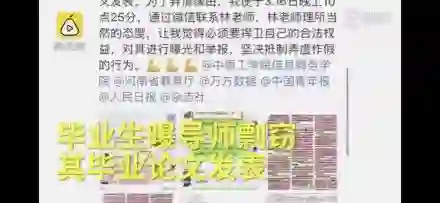 河南郑州,中原工学院信息商务学院毕业生在微博实名举报,其导师剽窃她的毕业论文,未经允许发表到期刊上去,复制比达到90%。