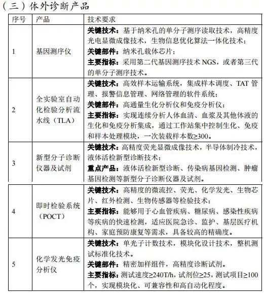 鼓励国内空白的全实验室自动化检验分析流水线(TLA)等创新设备产业化。推动具备一定基础的高通量基因测序仪、化学发光免疫分析仪、新型分子诊断仪器、即时检验系统(POCT)等体外诊断产品及试剂升级换代和质量性能提升。