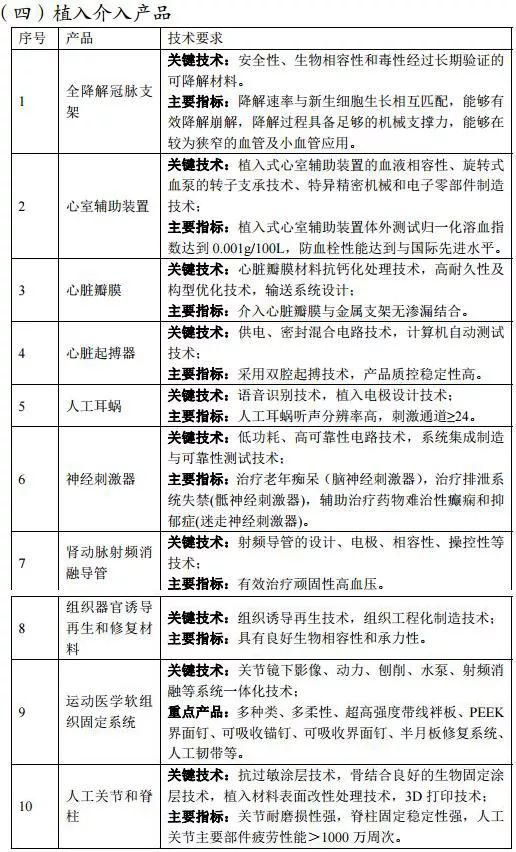 推动全降解冠脉支架、心室辅助装置、心脏瓣膜、心脏起搏器、人工耳蜗、神经刺激器、肾动脉射频消融导管、组织器官诱导再生和修复材料、运动医学软组织固定系统等创新植入介入产品的产业化。