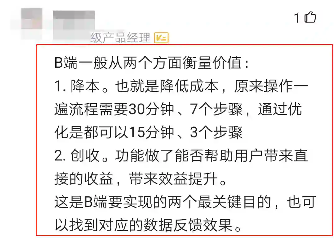 有人认为,可以从降本和创收这两方面来衡量B端产品的价值,并通过具体案例描述进行了解释,比如降低操作成本,帮助用户解决问题获取收益等等。