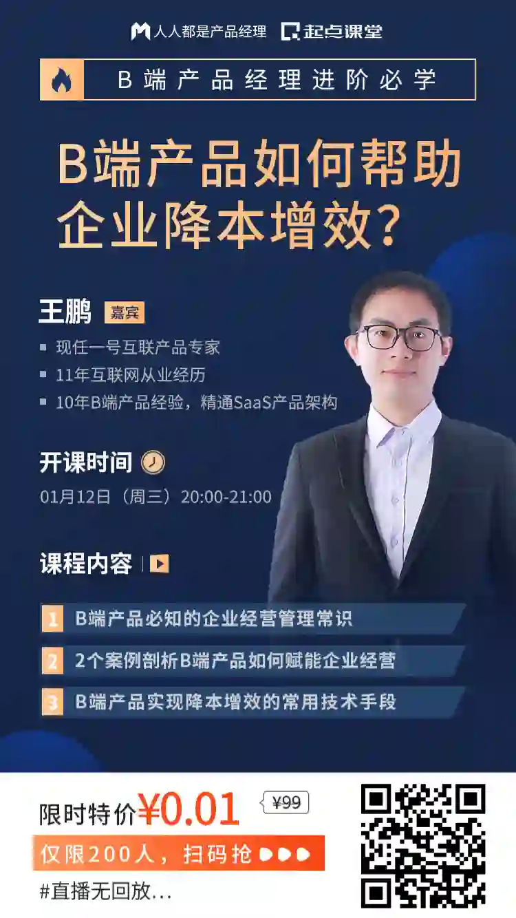 为此,人人都是产品经理社区&起点课堂准备了一场主题为《B端产品如何帮助企业降本增效?》的公开课。