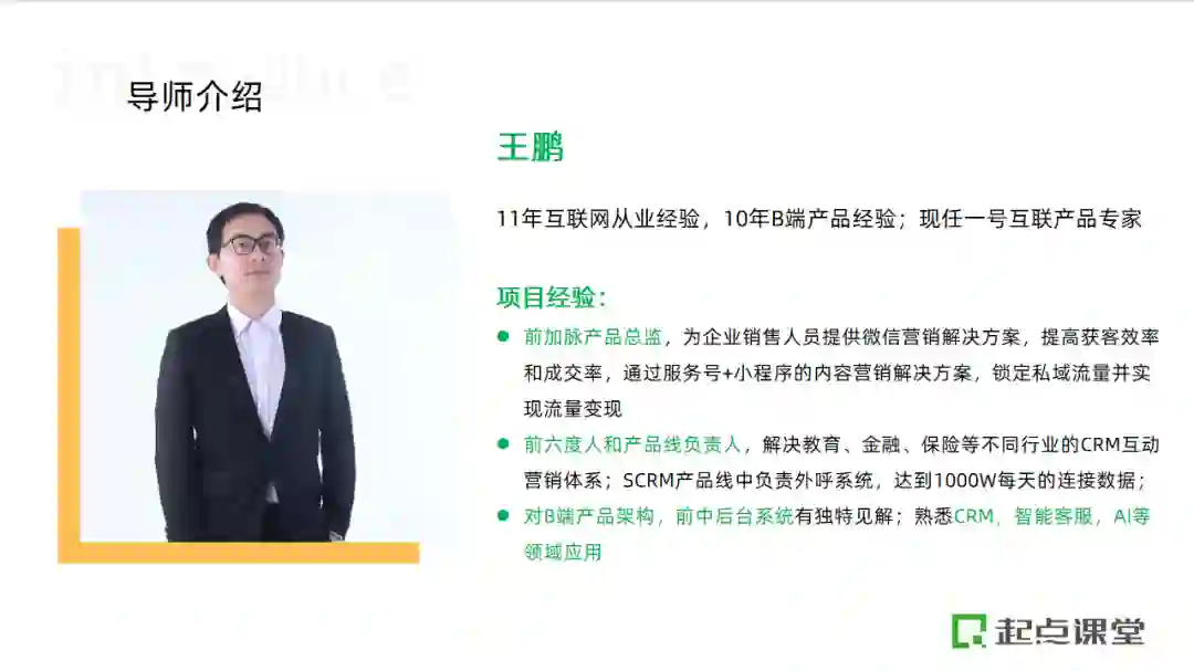 这是由起点课堂出品的B端产品公开课,专为正在做B端产品同学,或者对B端产品感兴趣想要了解相关工作内容的同学打造,课程将由现任一号互联产品专家@王鹏老师直播授课。