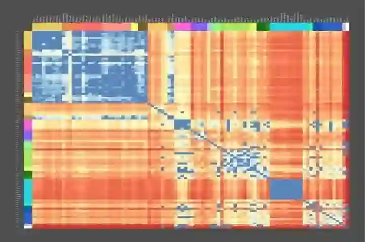 成年人大脑结构上的基因使用模式是高度定型和可再现的。 Figure 0 中所示的动态热图表示跨个体的这种图案化模式的共同结构,特别是一些介于解剖区域对(pairs of anatomic regions)之间差异表达的基因数目,在我们的实验测量中,有5/6的大脑中发现了类似共同的模式。 热红色阴影代表在其转录调节中非常不同的脑区域,而较冷的蓝色阴影代表高相似性的区域。