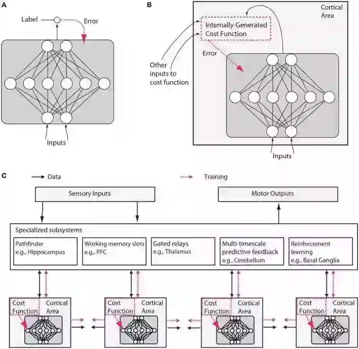 Figure 1. 传统人工神经网络和类脑神经网络设计之间的假设差异。 (A)在常规深度学习中,监督训练基于外部提供的标记数据。 (B)在大脑中,网络的监督训练仍然可以通过对误差信号的梯度下降发生,但是该误差信号必须来自内部生成的成本函数。这些成本函数本身是由遗传基因和后天学习所指定的神经模块计算而来。内部生成的成本函数创建heuristics(这个实在不好翻译,“启发”有些抽象,类似于元信息,大家意会吧),用于引导更复杂的学习。例如,识别面部的区域可以首先使用简单的heuristic来训练以来检测面部,这种heuristic就比如是在直线之上存在两个点,然后进一步训练以使用来自无监督学习的表示结合来自其他与社交奖励处理相关的大脑区域的错误信号来区分显著的面部表情。 (C)内部生成的成本函数和错误驱动的神经皮质深层网络经过训练形成包含几个专门系统的较大架构的一部分。虽然可训练皮层区域在这里被示意为前馈神经网络,但是LSTM或其他类型的recurrent网络可能才是更较精确的比喻,并且许多神经元和网络性质例如神经脉冲、树突计算、神经调节、适应和稳态可塑性、定时依赖性可塑性、直接电连接、瞬时突触动力、兴奋/抑制平衡、自发振荡活动、轴突传导延迟(Izhikevich, 2006)等将影响这些网络学习的内容和方式。
