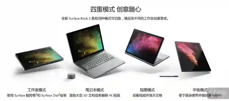使用铰链结构的可拆卸屏幕是Surface Book系列的最大亮点,通过拆装屏幕可以使Surface Book 2会变成一台超大平板,可以实现多种形态的变化,再结合Dial和触控笔的使用,大大扩展了其使用场景。