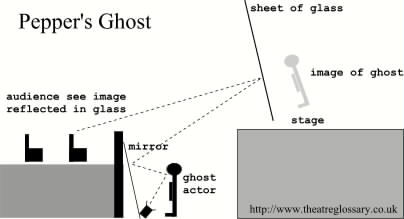 侃爷可能使用了一个维多利亚时代的把戏,叫做「佩珀的幽灵」(Pepper's Ghost) ,在舞台上用半透明的镜子来反射从放映机上传来的电影。