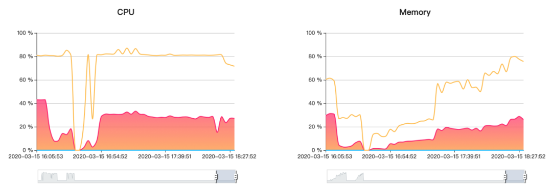下面是使用 2 个节点时的相关监控信息,可观察 CPU 及内存占用变化