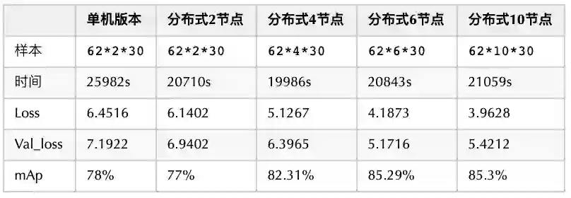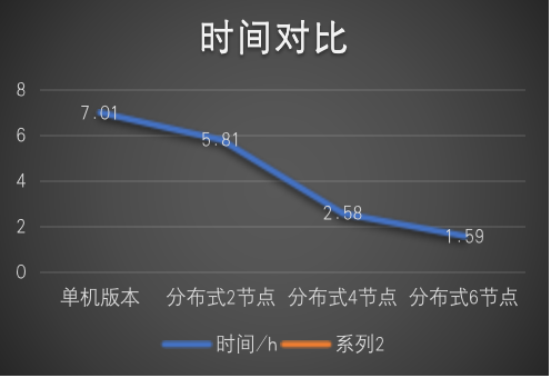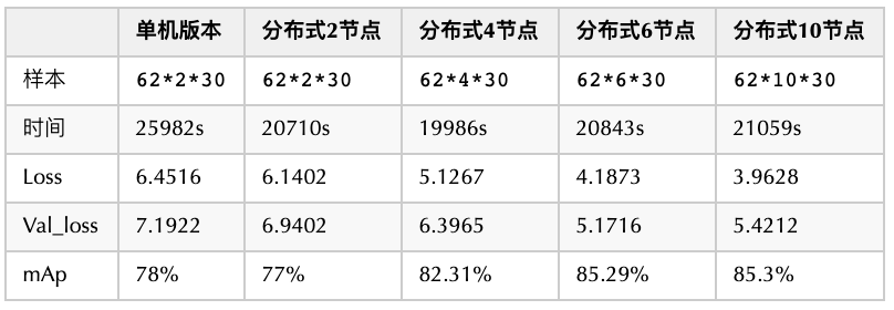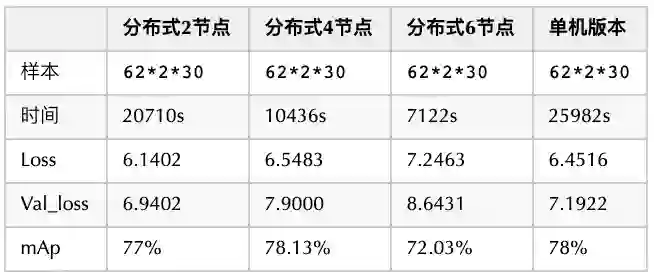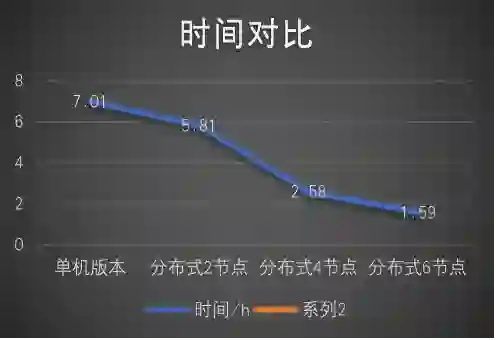 在采用同样训练样本数量的情况下,从下表可以看到,采用 6 个节点的分布式实现,所耗费时间只有单机时间的约 27%。