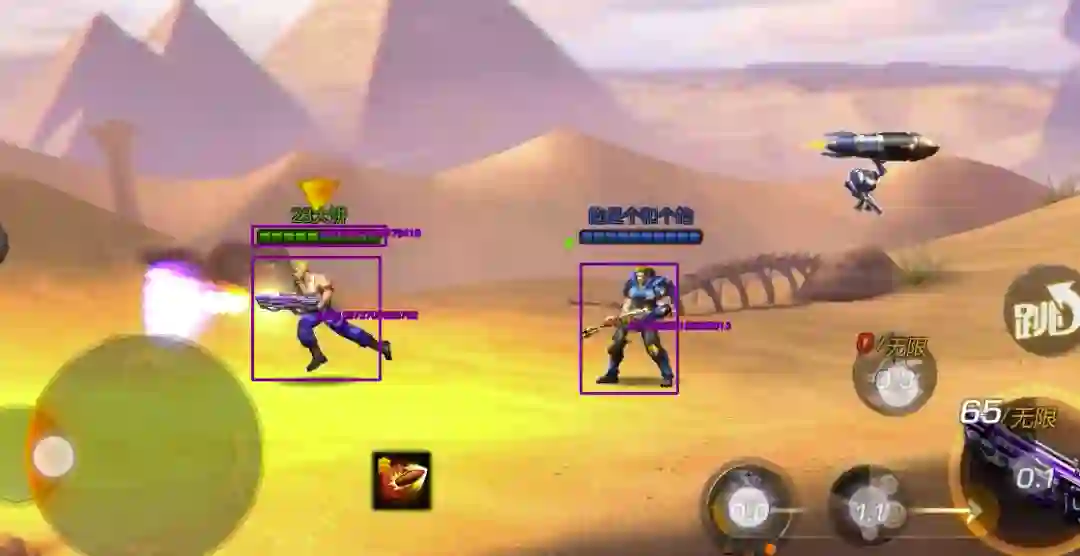 最近,YOLOv3 的创始人突然宣布停止 YOLO 相关开发,但 YOLO 作为目前最经典的快速目标检测算法,仍然是各种工业应用产品中的首选。在我们的自动化检测服务中,对 UI、游戏内目标及视频内容的识别,大多是基于 YOLO 模型实现,在魂斗罗游戏中目标的识别应用如下图: