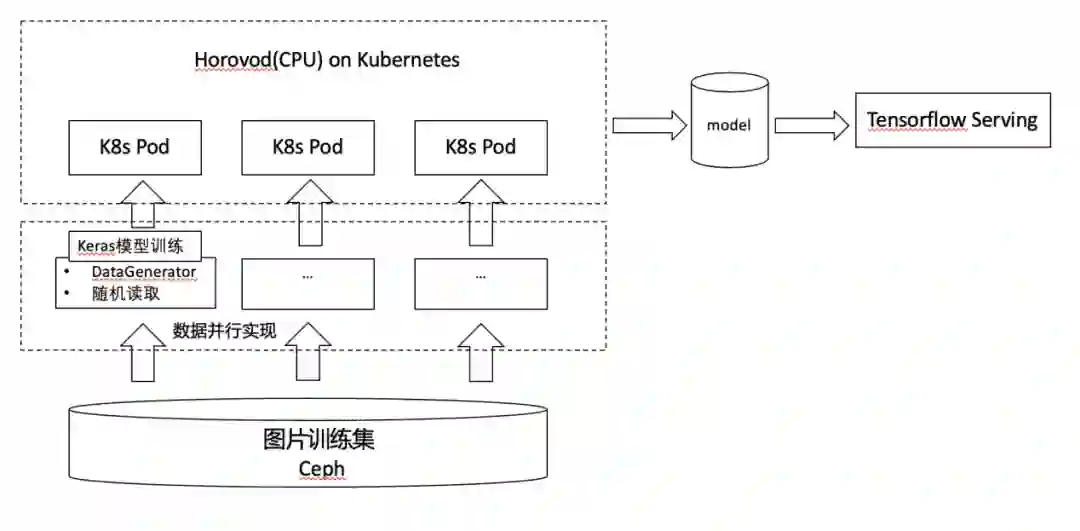 基于上面目标,在多种方案比较后,我们选择了 Kubernetes + Horovod + Keras + Tensorflow Serving 的实现,其整体流程如下: