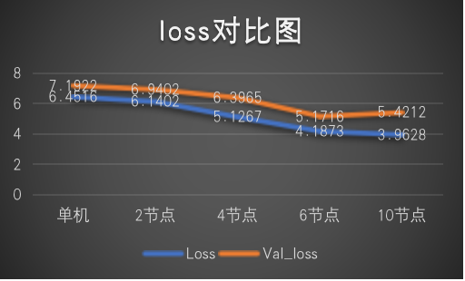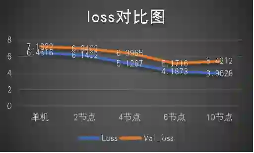 下图中样本量是图片数量*节点数量*epoch,可以看到在相近时间内,采用 10 个节点的分布式训练比单机训练的 Loss 减少了一倍,同时训练了近 5 倍的数据量。