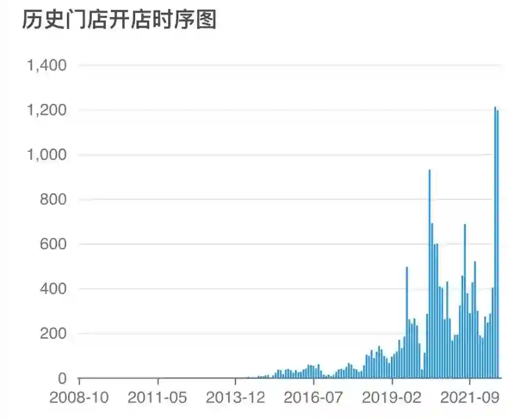 在很长一段时间,蜜雪跟coco都可、一点点相比并不出彩,2019年是一个关键分水岭,当年门店数达到7225家,这之后疫情来临,蜜雪门店规模却继续保持高增长,分别在2020年、2021年进一步增长到1.3万家、2.1万家。