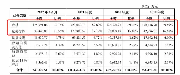 根据招股书,蜜雪2021年主营收入Top3分别为食材、包材、设备设施,三者占主营收入比例分别为70%、17%、6.7%。这一构成与此前2019年、2020年情况基本一致。相比之下,来自加盟商管理的收入占比在2019年-2021年分别仅为2.34%、2.14%、2.62%。
