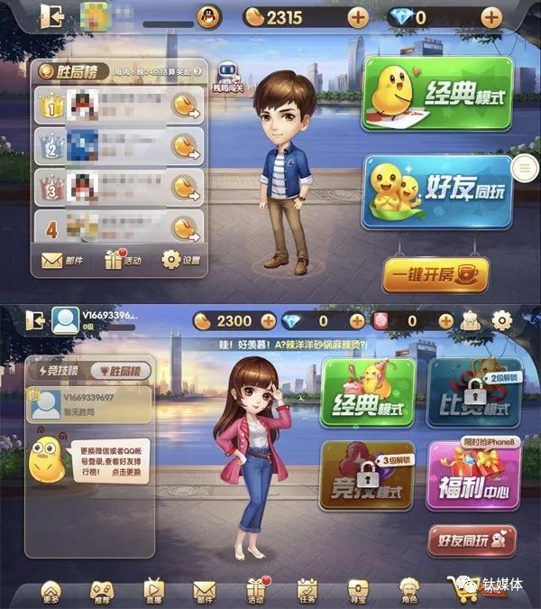 而《欢乐斗地主》则是腾讯棋牌的当家招牌之一,我们对比了《欢乐斗地主》的APP版本和H5版本,发现H5版本远比APP更重视“好友开房”等社交功能。H5版本打开游戏就是个硕大的“好友同玩”按钮,这和APP打开之后各种比赛玩法模式的按钮密集排布形成了鲜明反差。