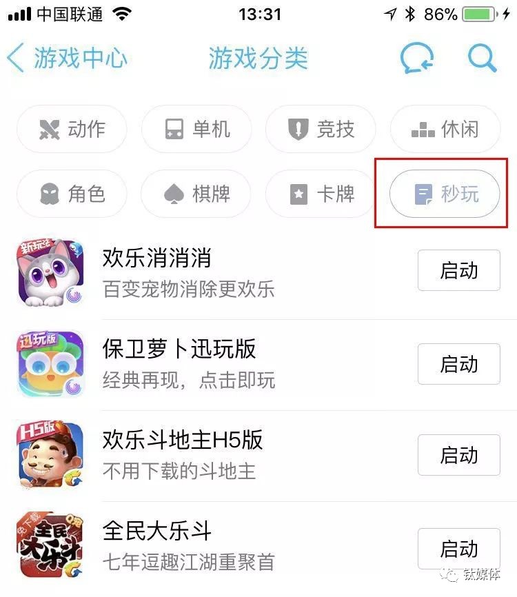 在移动QQ的游戏中心中, “秒玩游戏专区”已成为一个独立类目,该类目中所有产品均为H5游戏。目前秒玩专区里,共有5款产品,包括《欢乐消消消》、《保卫萝卜迅玩版》、《欢乐斗地主H5》、《全民大乐斗》以及《爱消除乐园》。虽然产品不多,但每款产品都堪称重磅。