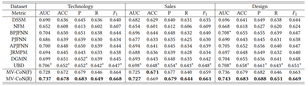 原因是该任务比传统推荐场景数据更加稀疏;同时,DSSM在大多数情况下表现不佳,因为它无法捕获文本信息中的时序信息;BPJFNN、PJFNN、APJFNN、JRMPM和DGMN之间的性能差异很小,并且针对不同指标或不同领域会有微小差别;此外,UBD是唯一训练时解决噪声问题的baseline,与其他baseline方法相比,该方法的效果有显著提升,这也侧面证实了该任务下处理噪声数据的必要性。