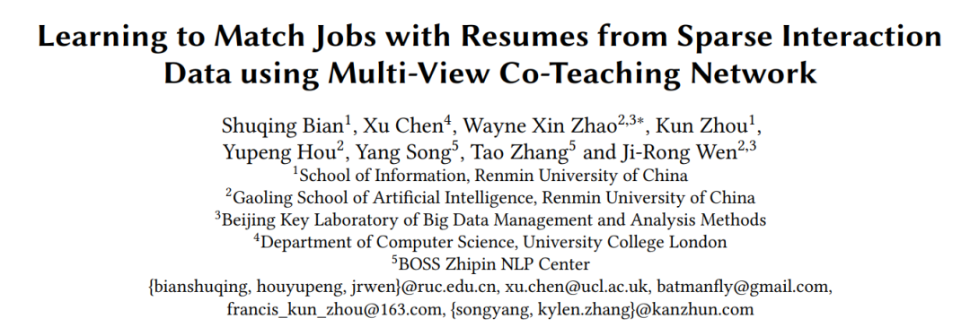 论文题目:《Learning to Match Jobs with Resumes from Sparse Interaction Data using Multi-View Co-Teaching Network》。
