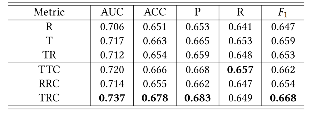 如表3所示,这里T代表文本匹配模块、R代表关系匹配模块、C代表协作学习网络。