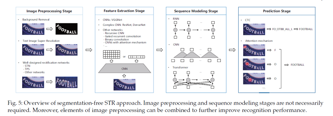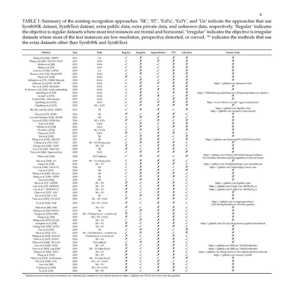 在文献[26],[27],[28],[29],[30],[31]中有一些STR综述。然而,上述[26]、[27]、[28]、[29]、[30]的调查大多已经过时。许多最近的进展,如2018年和2020年开发的算法,都没有包括在这些调查中。我们建议读者阅读这些论文,以获得更全面的历史文献综述。此外,Zhu等人的[29]和Long等人的[31]综述了场景文本检测和识别的方法。Yin等人研究了视频中文本检测、跟踪和识别的算法。与这些调查不同的是,我们的论文主要关注STR,旨在对这一领域提供更详细和全面的概述。