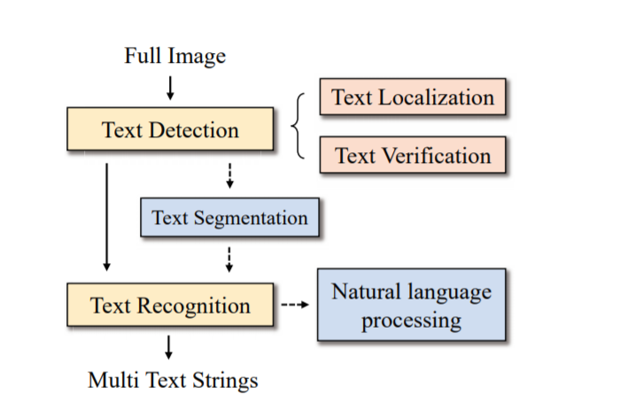 端到端系统的说明,定义了不同阶段的各种基本问题:文本检测、文本定位、文本验证、文本分割和文本识别。