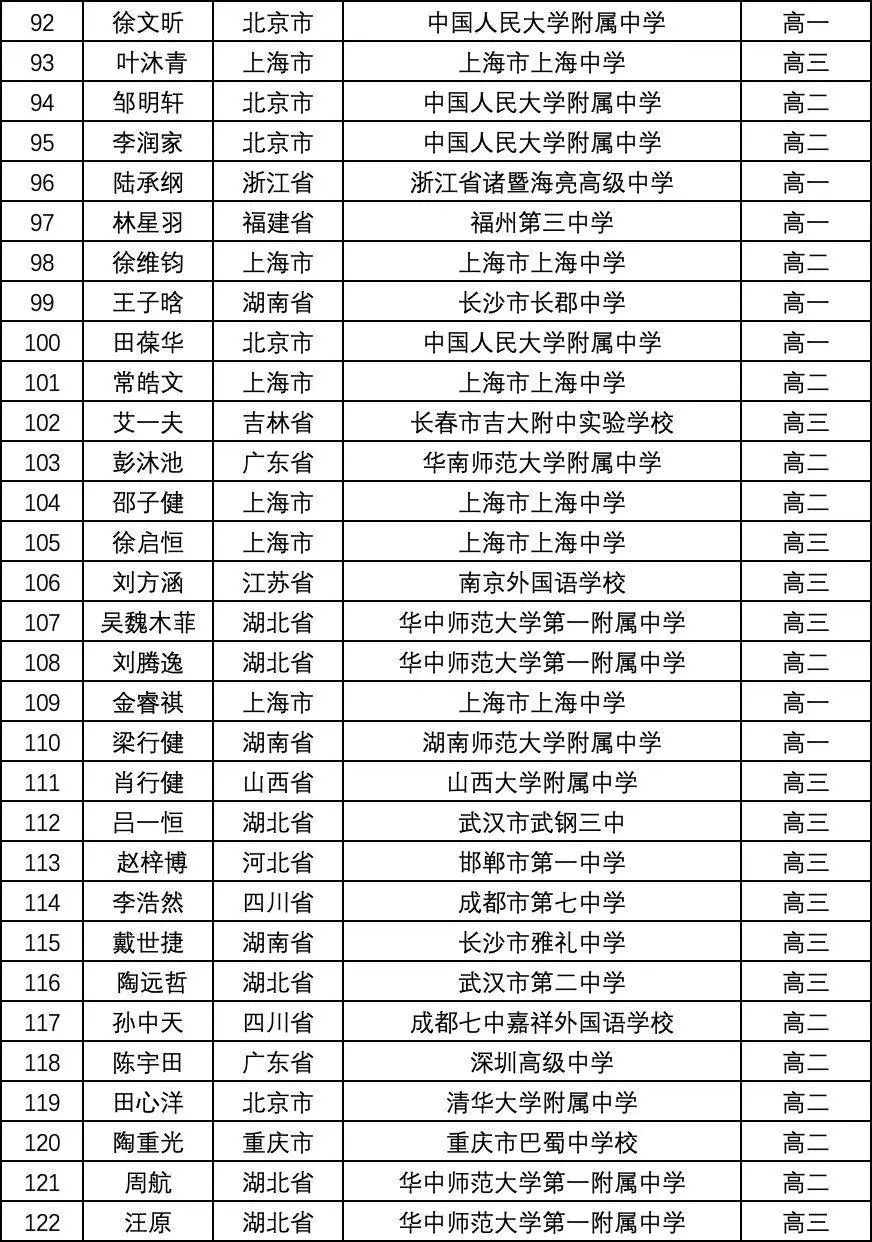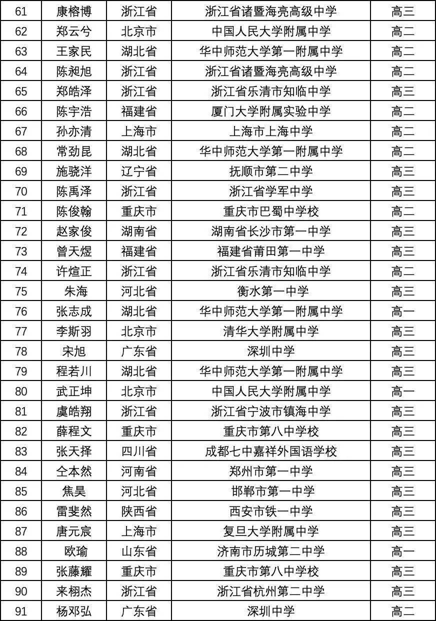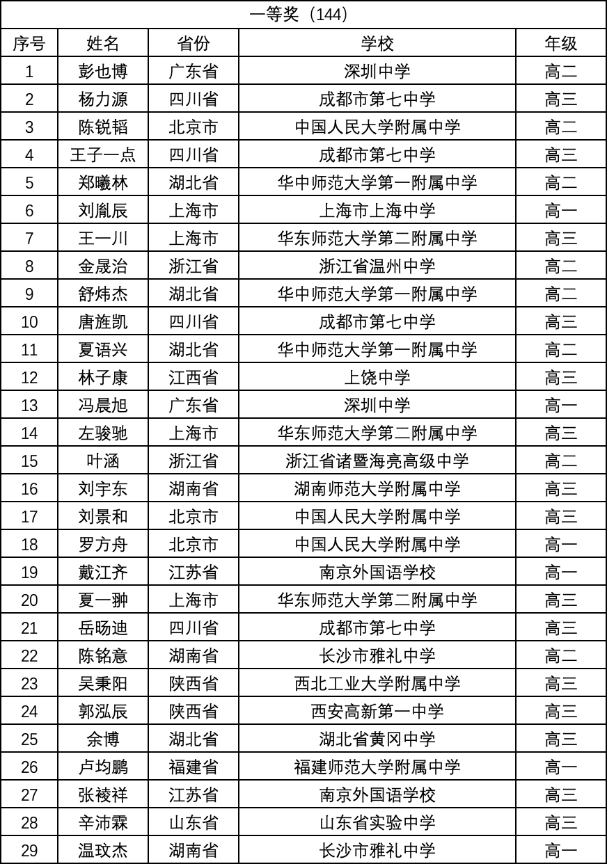 一等奖(金牌)完整名单如下: