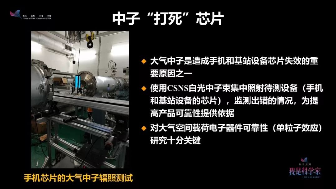 此外,还可应用于手机芯片的研究。大气中子是造成手机基站以及很多芯片服务器损坏的原因,而散裂中子源的白光中子源能够给这些芯片以及服务器提供出错的条件(我们常说的“打死”就是看它在什么条件下出错),让科学家在此条件下找出原因。同时,对大气空间载荷的器件可靠性(就是我们常说的“单粒子效应”)也有非常大的帮助。