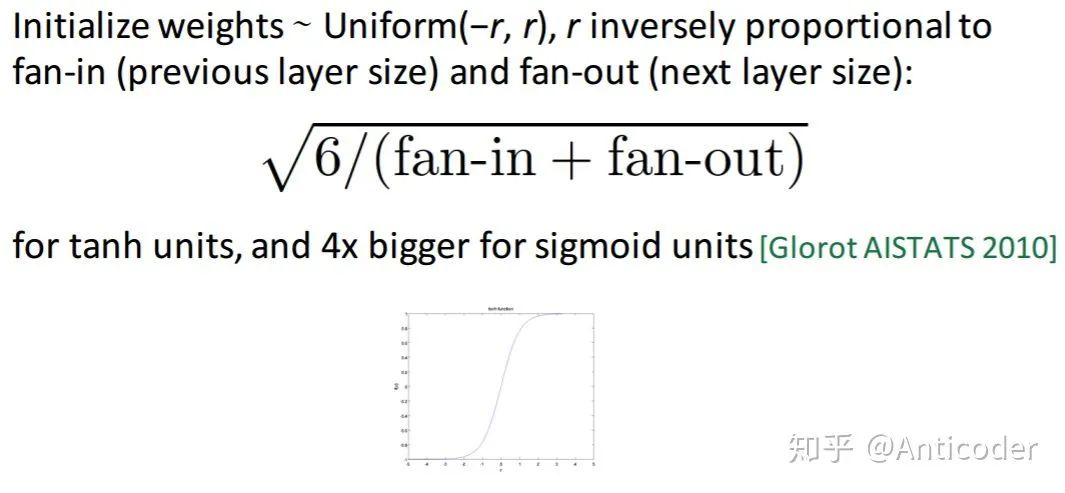 更放心一点,可视化每一层feedforward输出的取值范围,梯度范围,通过修改使其落入激活函数的中间区域范围(梯度类似线性);如果是ReLU则保证不要输出大多为负数就好,可以给bias一点正值的噪声等。当然还有一点就是不能让神经元输出一样,原因很简单