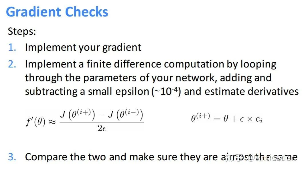 Gradient Check,如果你觉得网络feedforward没什么问题,那么GC可以保证BP的过程没什么bug。值得提的是,如果feedforward有问题,但是得到的误差是差不多的,GC也会感觉是对的。大多情况GC可帮你找到很多问题!步骤如下: