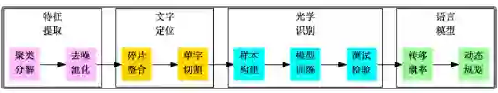 作为OCR系统的第一步,特征提取是希望找出图像中候选的文字区域特征,以便我们在第二步 进行文字定位和第三步进行识别。在这部分内容中,我们集中精力模仿肉眼对图像与汉字的处理过程,在图像的处理和汉字的定位方面走了一条创新的道路。这部分工作是整个OCR系统最核心的部分,也是我们工作中最核心的部分。