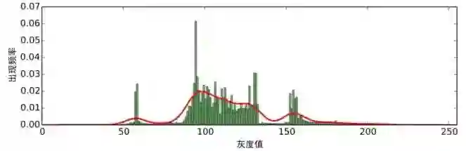 核密度估计 经过预处理的图像,我们可以对每个色阶的出现次数进行统计,得到如图5的频率分布直方图: