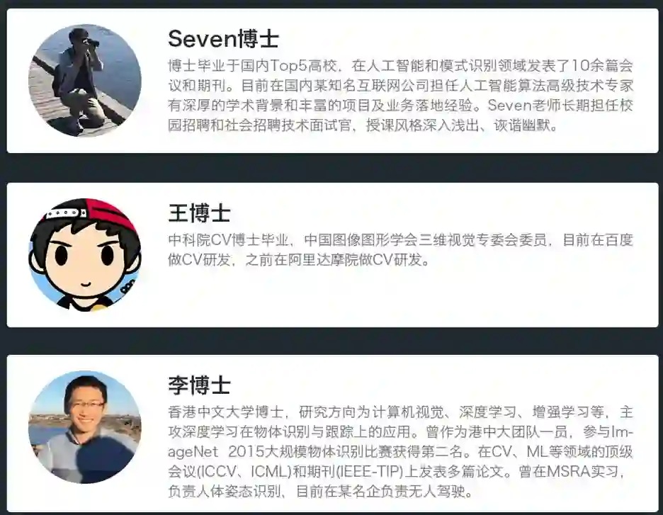 本课的另外两位老师也堪称大佬!一位是曾在达摩院负责CV研发的王博士。另一位则是在顶级大赛中拿过冠亚军的李博士。