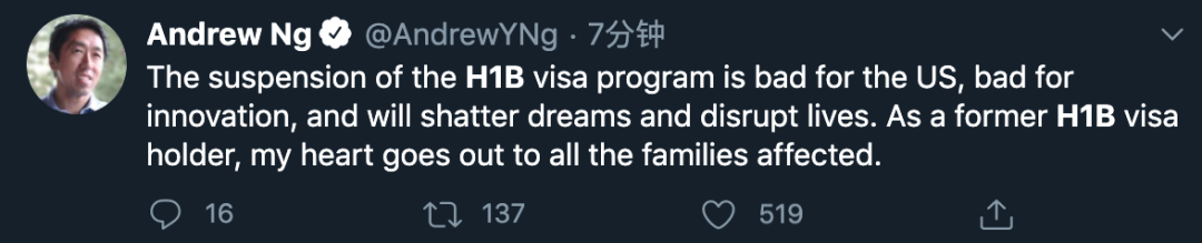 斯坦福大学教授吴恩达曾公开表示:「暂停 H-1B 签证对美国、对创新绝无益处,这将破坏人们的梦想、扰乱他们的生活。」