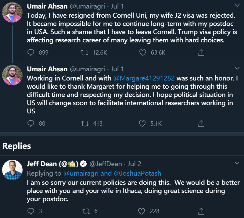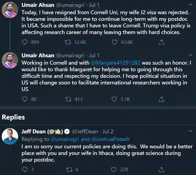 Umair Ahsan 是一位来自巴基斯坦的博士后研究员,他从澳大利亚拿到了博士学位,2019 年开始在康奈尔大学进行博士后研究,拿的是 J-1 签证。在他的新婚妻子申请配偶签证(J-2)被拒和特朗普政府宣布停发 J-1 签证之后, Ahsan 决定回巴基斯坦。
