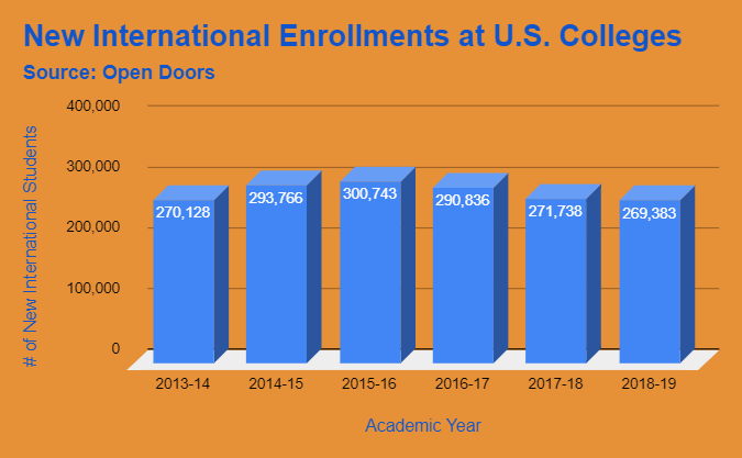 2019 年美国门户开放报告数据显示,美国所有高校招收的国际学生人数均有所下降,包括本科、研究生和非学位。