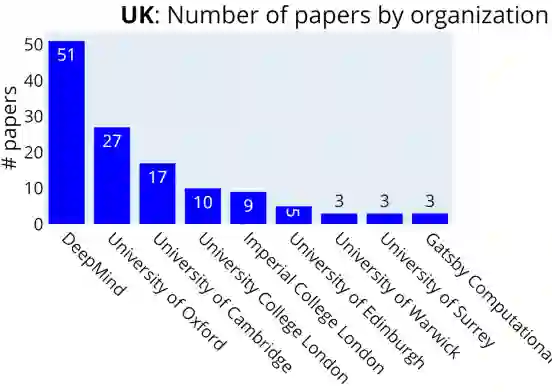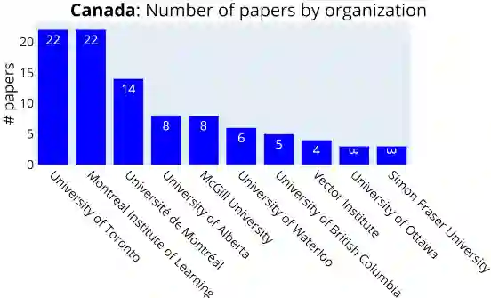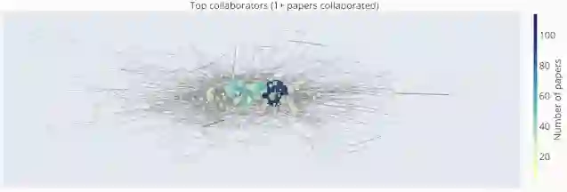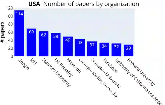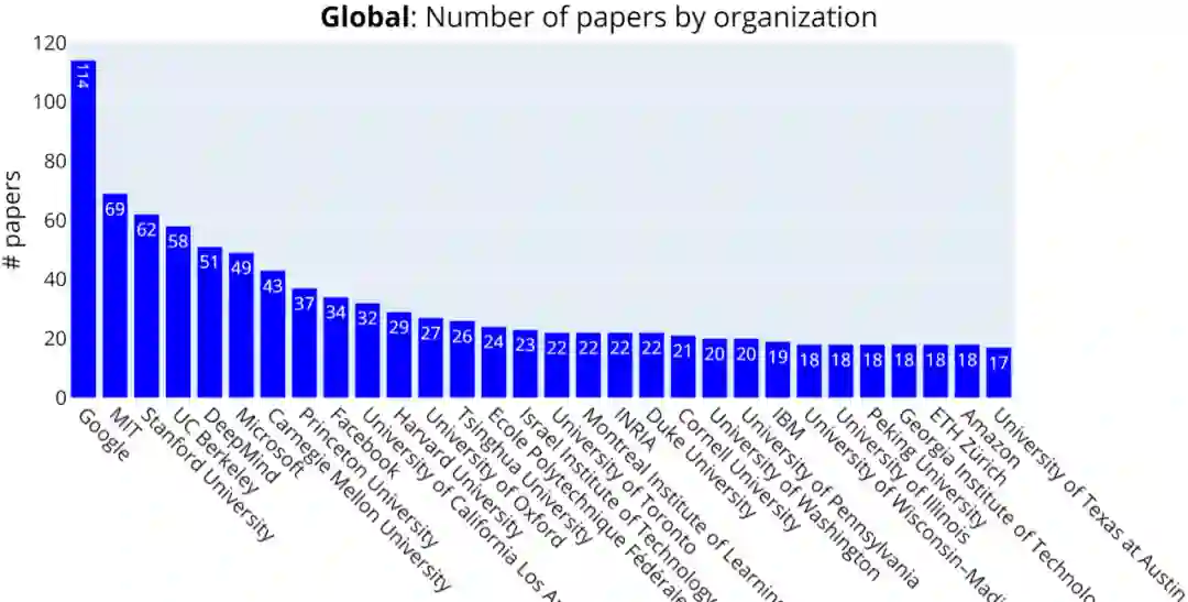 有趣的是,你会发现谷歌与其它公司的协作并不像其与大学之间的协作那么多。而 MIT 有许多工业领域的协作伙伴。 最后,来看一下每篇论文的作者和组织的总数。
