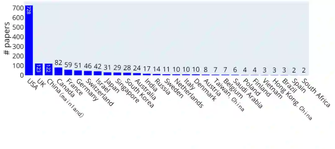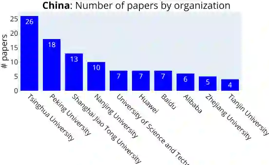 大多数论文有 1 或 2 个组织,但有些论文的撰写有 7 个组织的参与。 两篇有 7 个组织参与的论文分别是:由谷歌、微软、华沙大学、阿姆斯特丹大学、加州大学欧文分校、苏黎世联邦理工学院以及伦敦帝国理工学院的研究者协作完成的《How Good is the Bayes Posterior in Deep Neural Networks Really?》和由蒙特利尔大学、IIIT Hyderabad、麻省理工学院、Mila、特拉华大学以及 LinkedIn 等机构的研究者协作完成的《Learning To Navigate The Synthetically Accessible Chemical Space Using Reinforcement Learning》。 参考链接:https://medium.com/criteo-labs/icml-2020-comprehensive-analysis-of-authors-organizations-and-countries-c4d1bb847fde