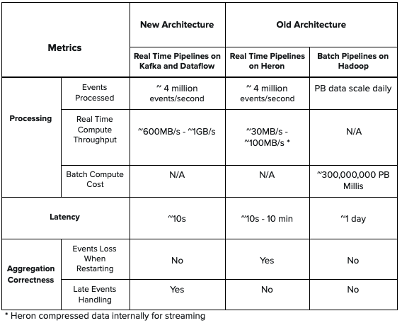 下面是两个架构之间的指标比较表。与旧架构中的 Heron 拓扑相比,新架构具有更低的延迟、更高的吞吐量。此外,新架构还能处理延迟事件计数,在进行实时聚合时不会丢失事件。此外,新架构中没有批处理组件,所以它简化了设计,降低了旧架构中存在的计算成本。
