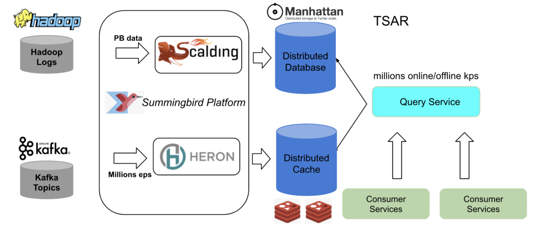 实时数据存储在 Twitter Nighthawk 分布式缓存中,而批处理数据存储在 Manhattan 分布式存储系统中。我们有一个查询服务,可以在这两个存储中存取实时数据,而客户服务则会使用这些数据。