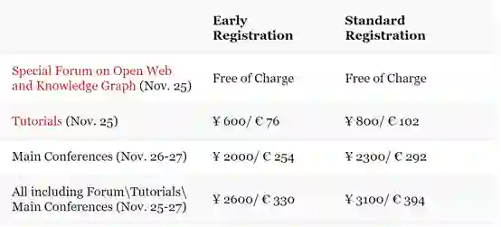 (注:请在注册页选择“Special Forum on Open Knowledge Graph”进行注册,本论坛不收取费用。因场地有限,将按注册先后顺序给申请者发送是否通过信息。注册链接:http://jist2019.85do.com/)