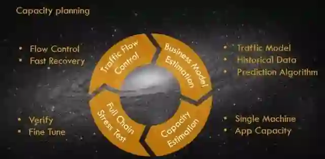 在双 11 等大促场景的准备过程当中,容量规划一般分为四个阶段: