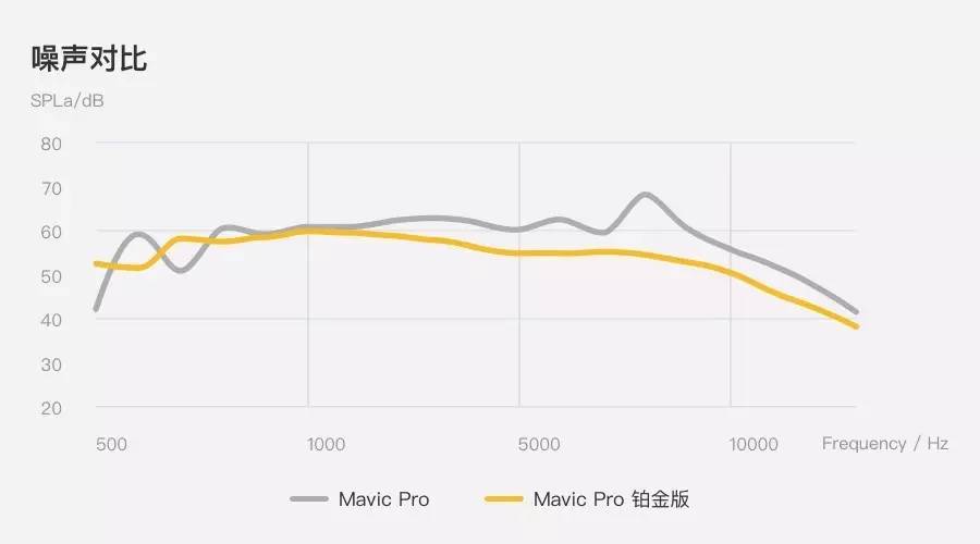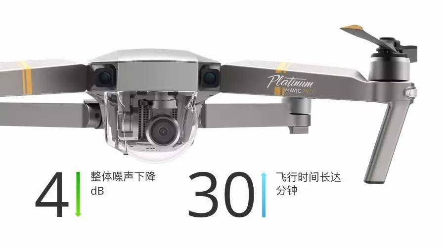 与Mavic Pro相比,Mavic Pro铂金版的续航时间增加了11%,由27分钟延长至30分钟;在一米距离外,声级计测量得出的整体噪声下降4分贝,相当于噪声功率降低60%。无论是起飞一刻还是加速瞬间,用户均可静心飞行,享受安静而畅快的飞行体验。
