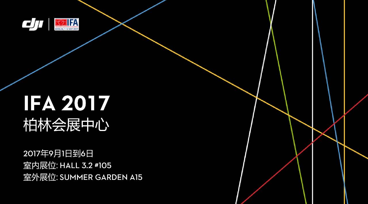 9月1日至6日,大疆携最新产品亮相IFA 2017。参展期间,大疆将于柏林国际展览中心3号楼2层的105号展位,向来宾展示“天地一体”的全套影像设备。展会期间,DJI将联合FiLMiC Pro开展灵眸Osmo Mobile手机云台工作坊,同时在室外设置飞行区域用于飞行体验。展位开放时间为当地时间10时至18时,欢迎莅临参观。