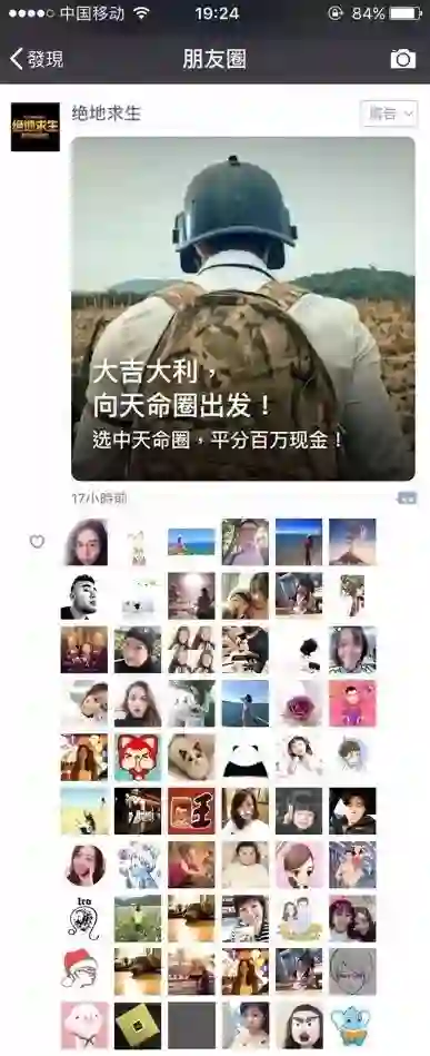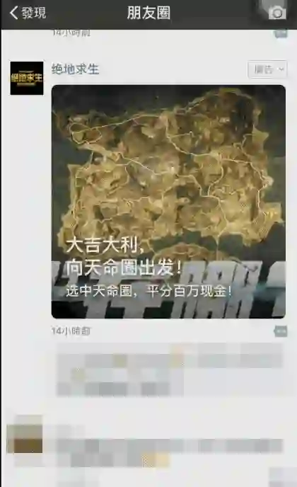 可以看出,这是微信与《绝地求生》国服间的一次深度合作。广告近乎动用了微信朋友圈基础设计中全部的功能——视频播放、文案阐述、关系链展示、小程序等。
