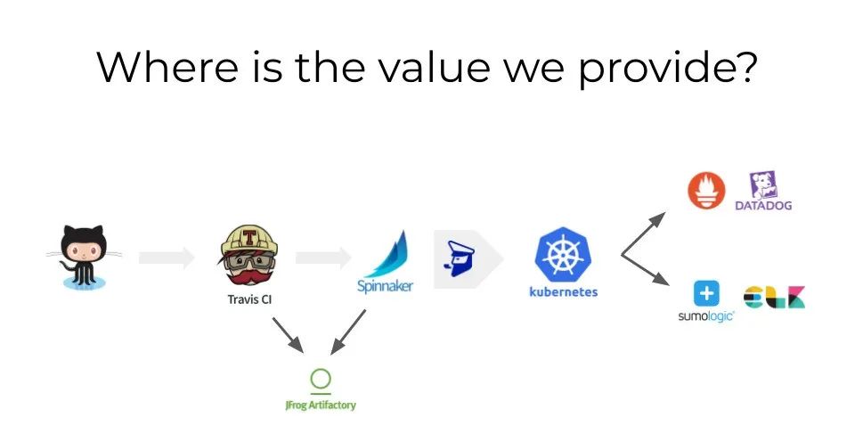 我们将 GitHub、Travis、Artifactory、Spinnaker、FIAAS、Kubernetes、Prometheus、Datadog、Sumologic 和 ELK 打包在一起。